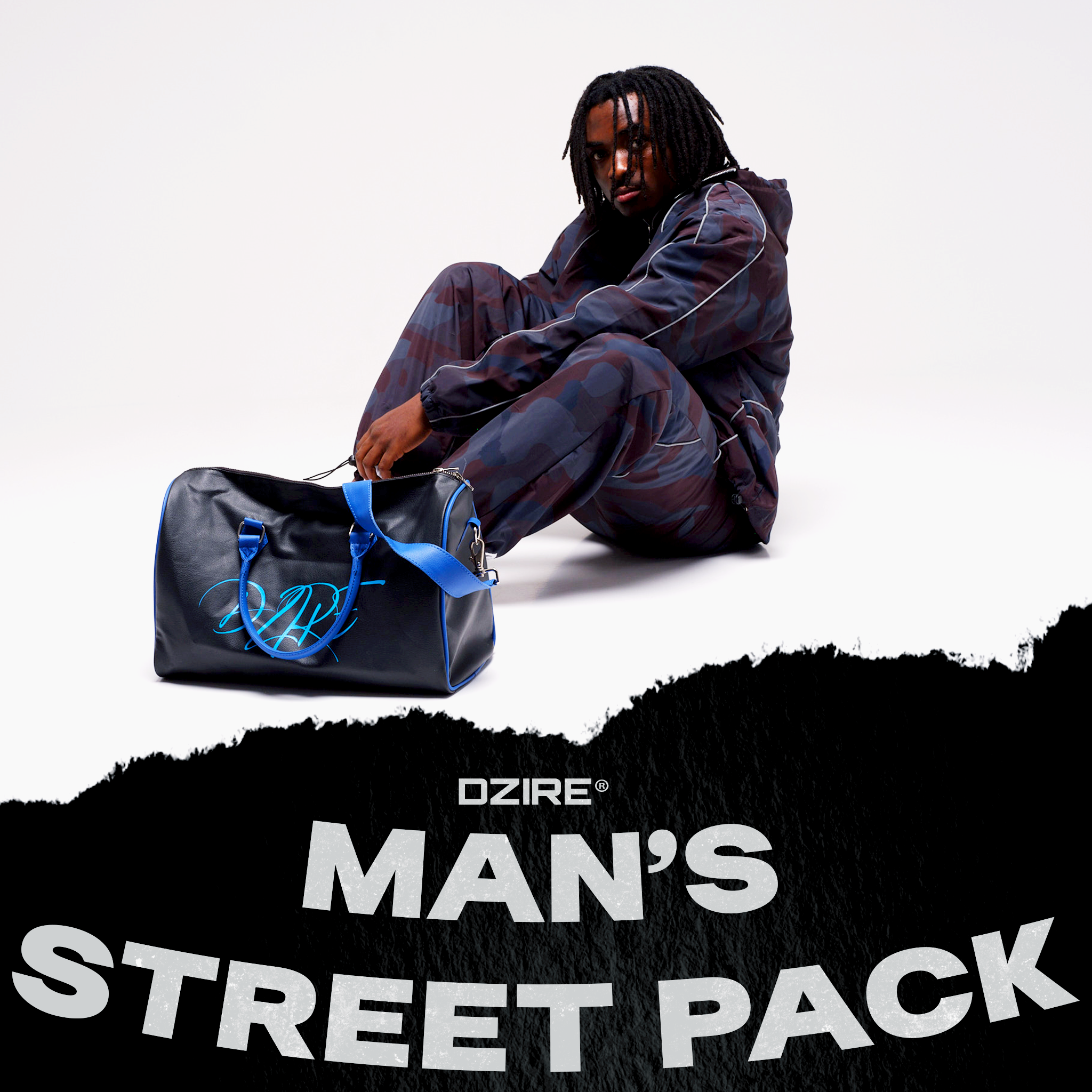 The Men’s Street Pack combines the full Noir Flow Set with the DZIRE Shadow Bag, creating a complete reflective look made for motion and dominance.