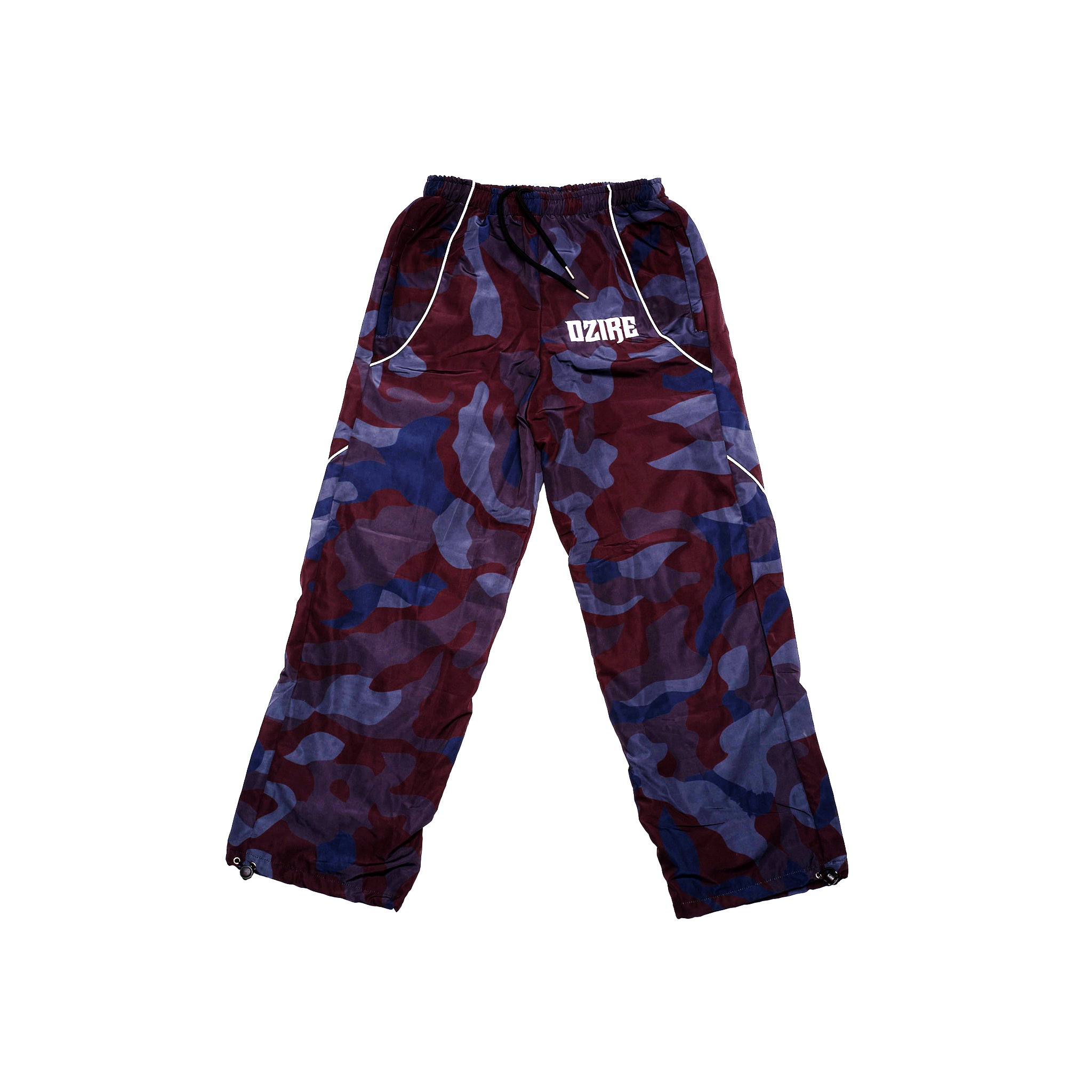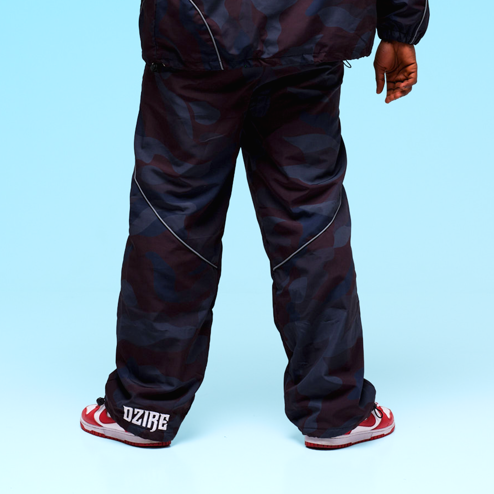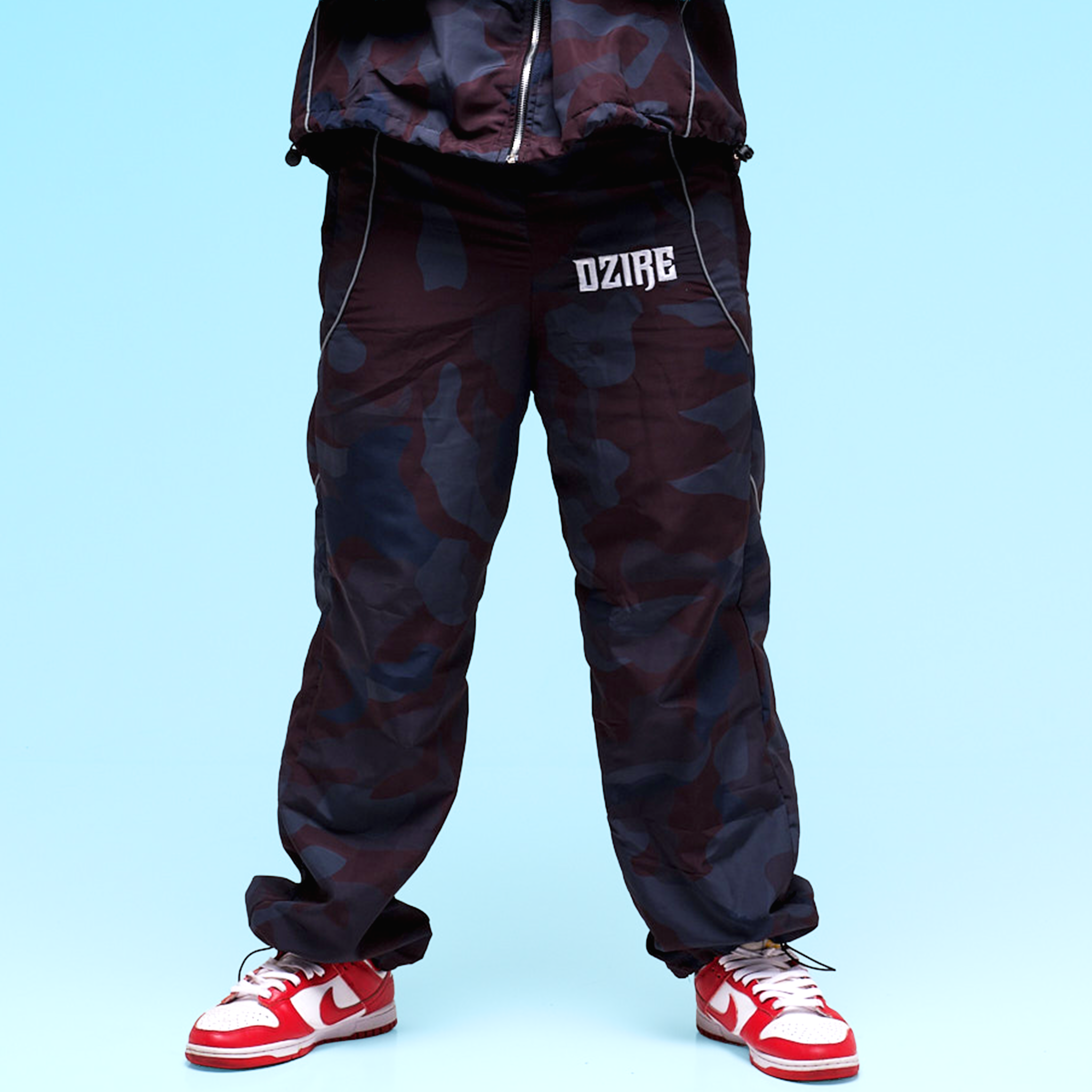 The Noir Flow Pants bring a clean reflective edge to every step. Made from lightweight windbreaker fabric with deep blue-black camo tones, built for comfort and movement. Finished with signature DZIRE piping and logo details — luxury street in motion.